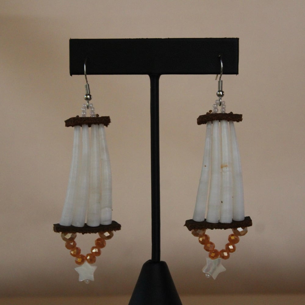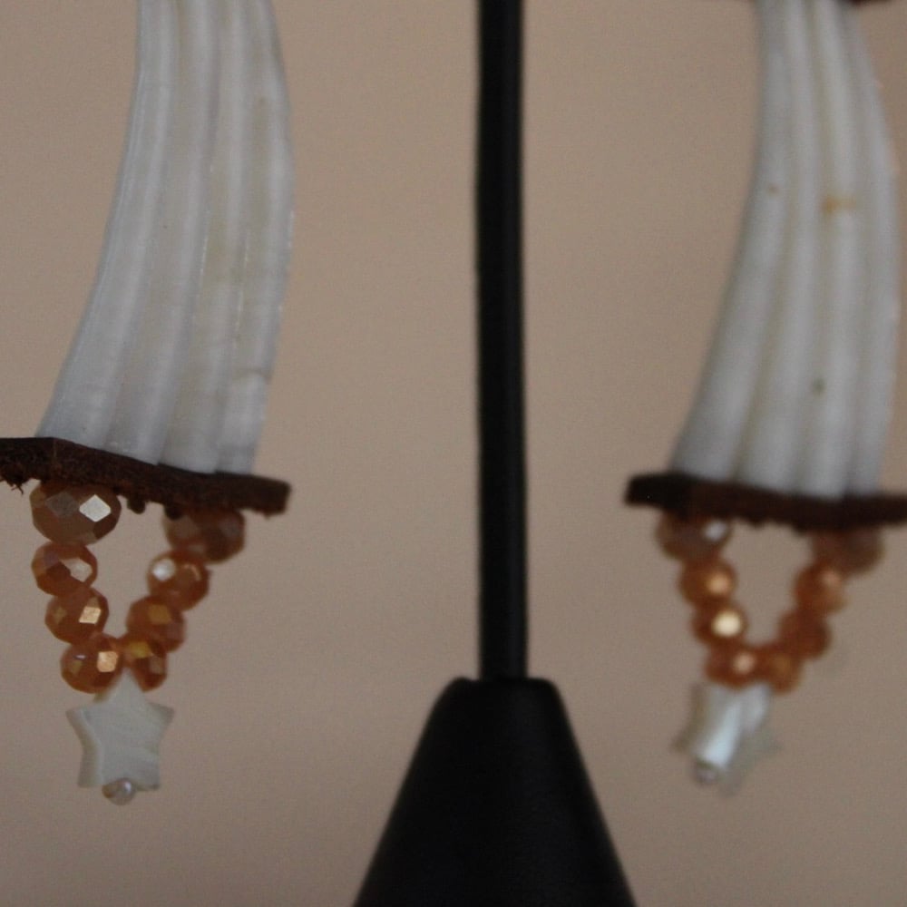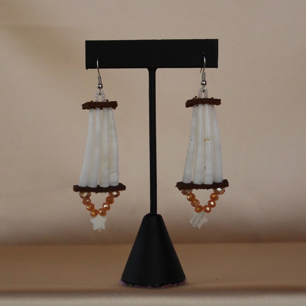 • Made from XL smooth white Dentalium shells, brown deer leather, faceted glass beads and white mother of pearl star beads.