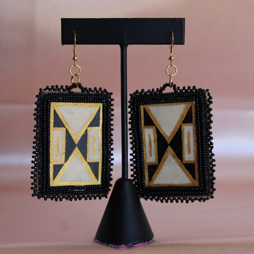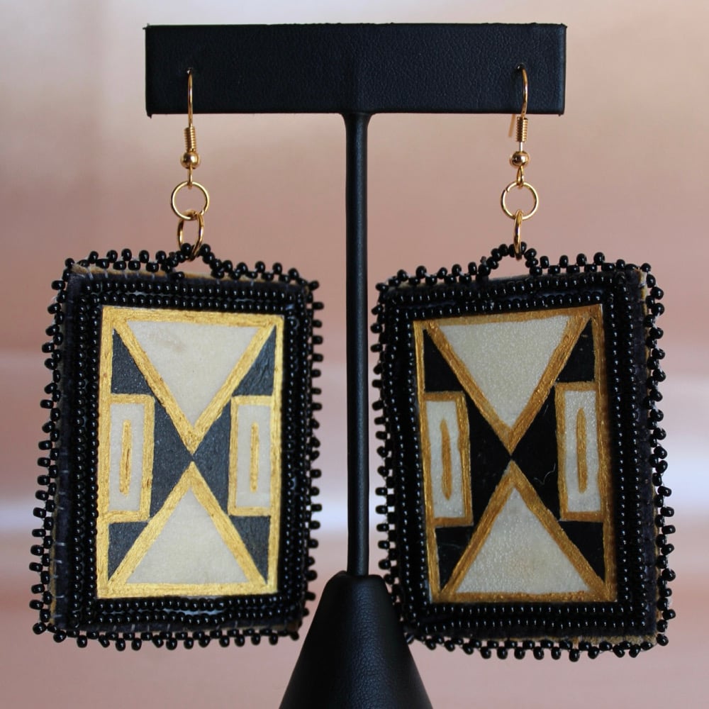 • Painted center is made from deer parfleche (rawhide), painted with acrylic paints and sealed with fixatif. Beaded and edged with size 11/0 seed beads, backed with tan deer leather.