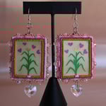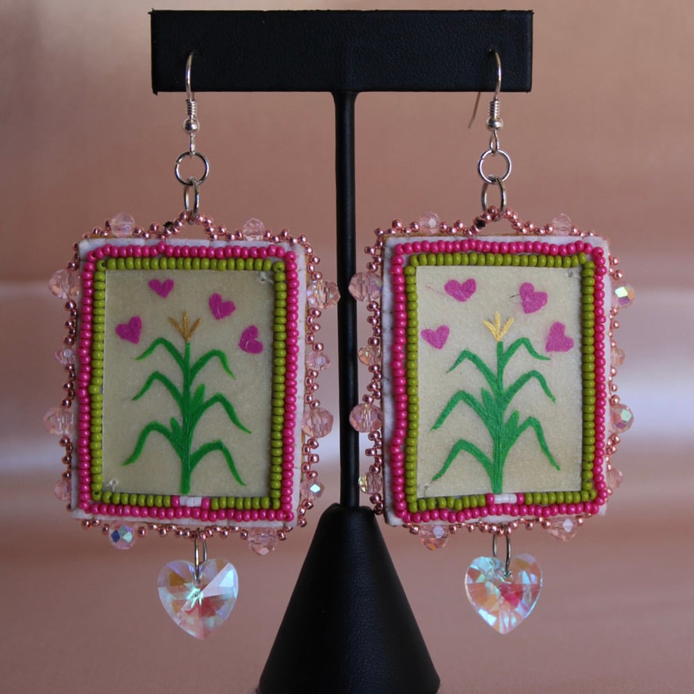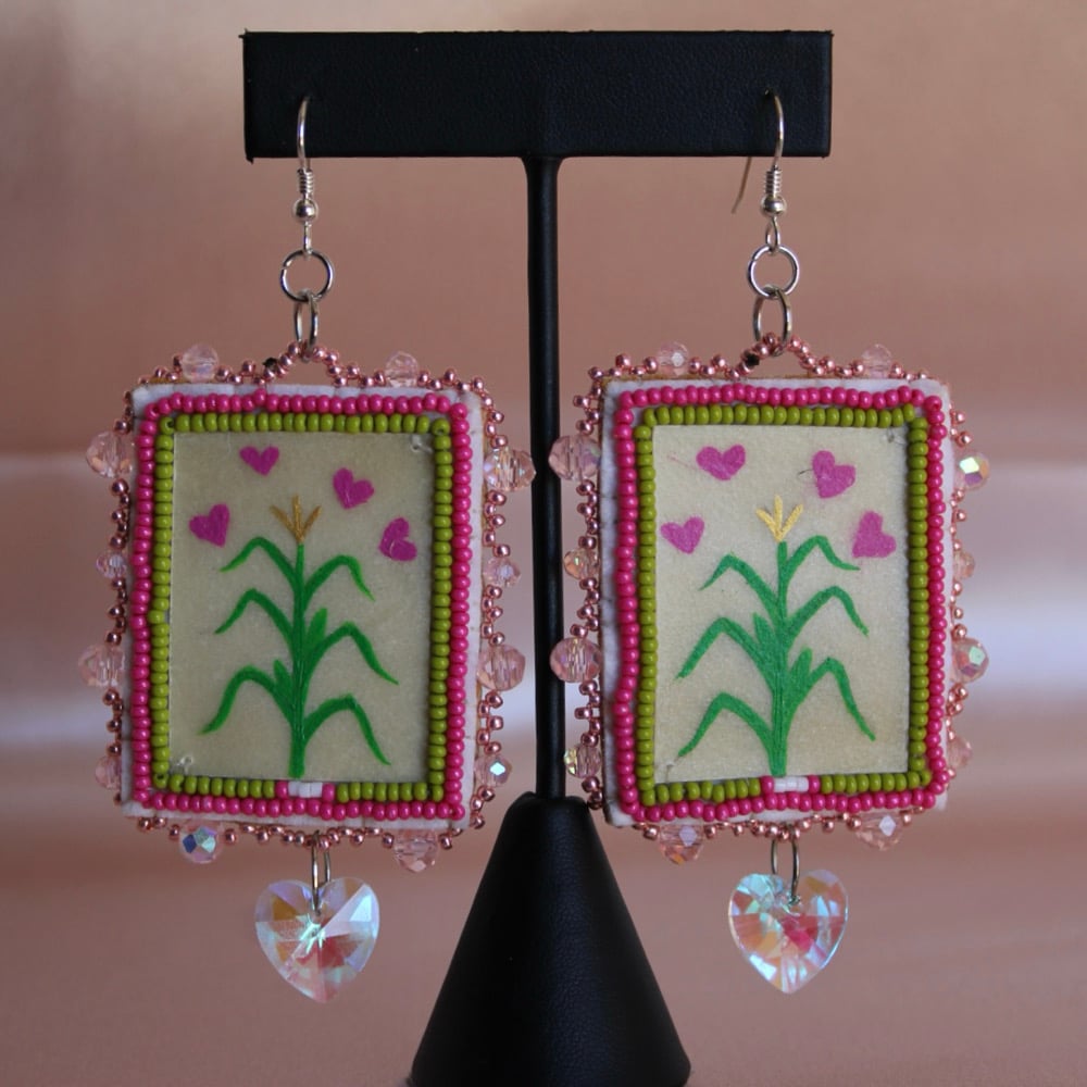 • Painted center is made from deer parfleche (rawhide), painted with acrylic paints and sealed with fixatif. Beaded with size 11/0 seed beads, backed with tan deer leather. Edged with 4mm and 6mm faceted glass beads.