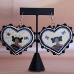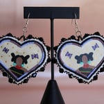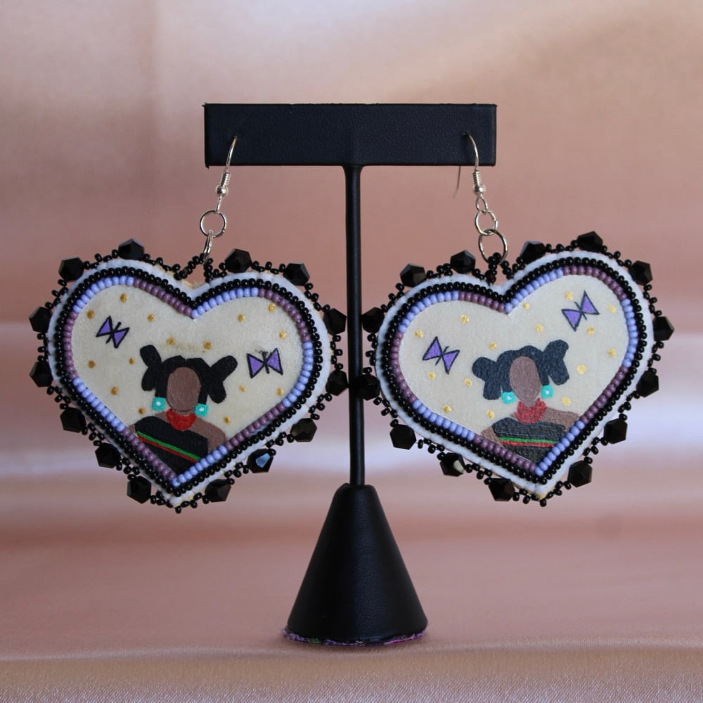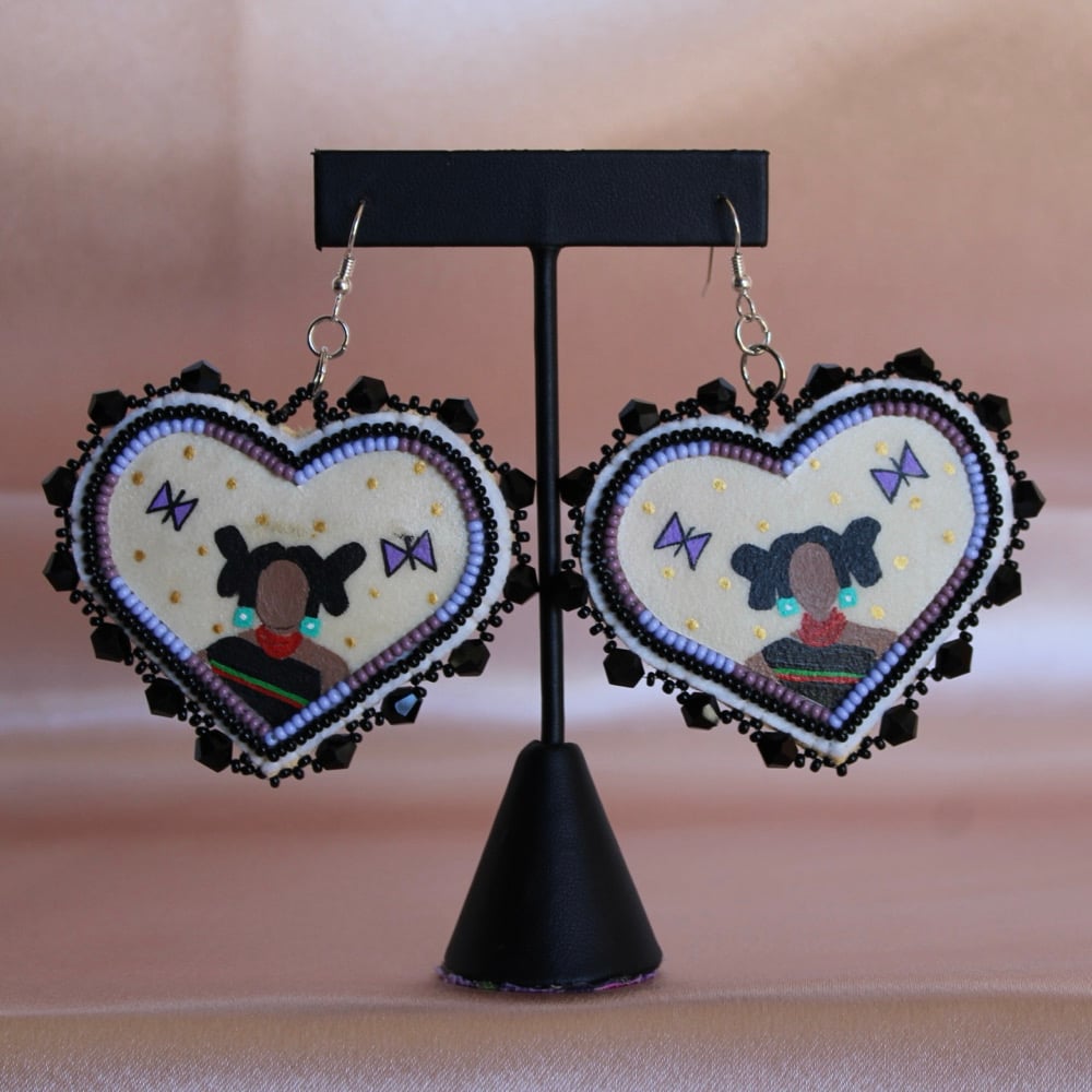 • Painted center is made from deer parfleche (rawhide), painted with acrylic paints and sealed with fixatif. Beaded with size 11/0 seed beads, backed with tan deer leather. Edged with 6mm bi-cone glass beads.