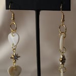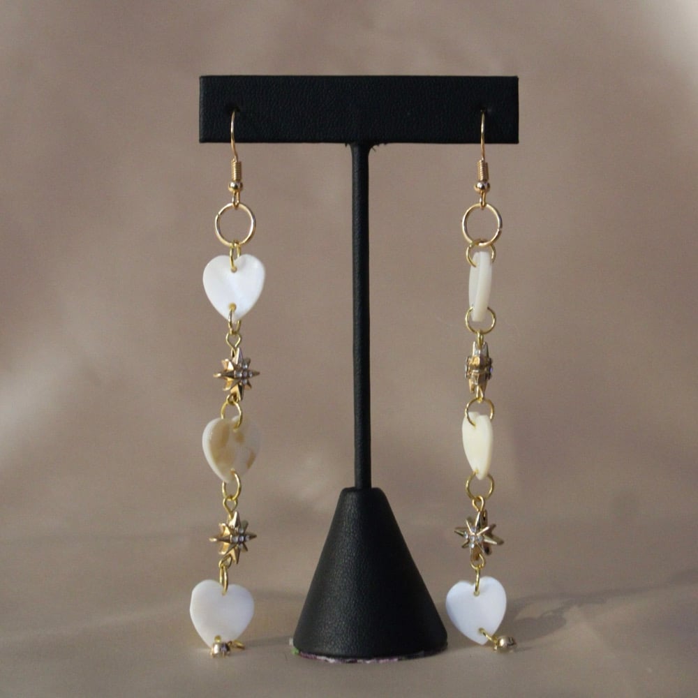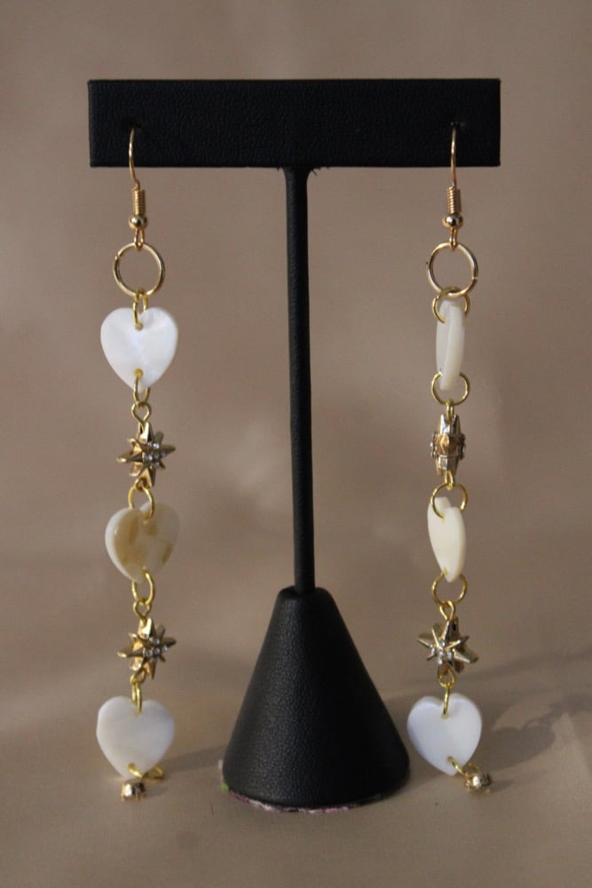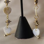 • Made from genuine mother of pearl shell hearts, plated starburst 18k beads, plated 18k hooks and findings.